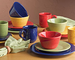 We finally picked out some new everyday dishes which we will get once we move. I'm attaching a picture of them. They are made by Pfaltzgraff and are called Nuance of Gold, Red, Navy, Sage. We think they are very nice.....